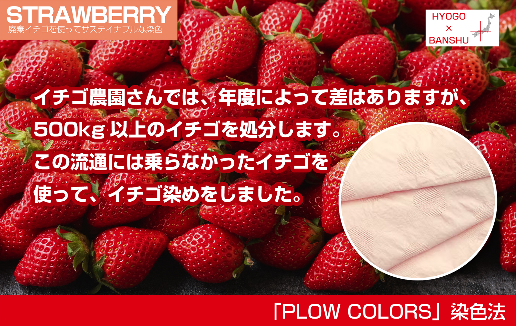 播州織を広める中で、この取組を行っている会社があることを知り、一も二も無く使わせて欲しとお願いし、快諾頂きました。イチゴ染めは廃棄されるイチゴを原料に、独自の染色方法で糸を染めた物です。『PLOW COLORS』と呼ばれるこの技法は、半年掛けて試行錯誤の後生まれた技法です。優しい色合いが播州織ととてもよくあっています。