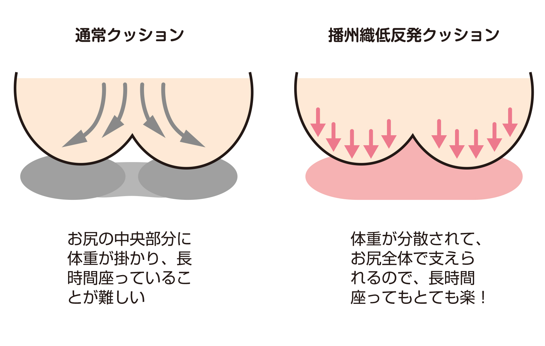 播州織低反発クッションは、とても疲れにくく長時間座ってもお尻が痛くなりにくい構造になっています